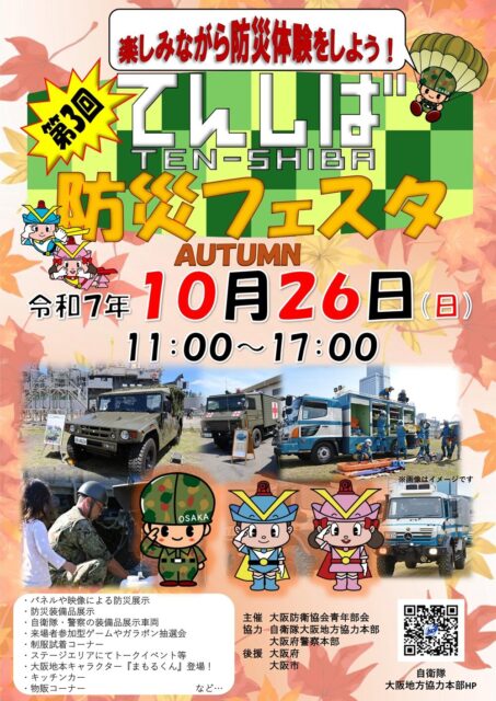 天王寺公園「てんしば」で開催される、見て・触れて・学べる防災イベント「秋のてんしば防災フェスタ2025」。災害派遣活動車両や装備品の展示、自衛隊の制服試着コーナーのほか、参加型ゲームやガラポン抽選会も登場。ステージでは防災トークショー、吹奏楽演奏や太鼓演奏、ダンスパフォーマンス、ビンゴ大会など内容盛りだくさん。自衛隊大阪地方協力本部のゆるキャラ「まもるくん」も登場し、楽しみながら防災を学べる1日です。